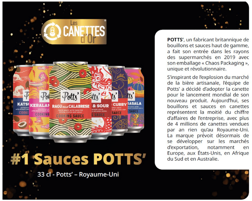 Basée à Marlborough, au Royaume‑Uni, Potts’ est un fabricant haut de gamme de bouillons et sauces qui a secoué les codes dès 2019 avec son « Chaos Packaging », un design audacieux et immédiatement reconnaissable. Inspirée par l’essor de la bière artisanale, l’équipe a parié sur la canette pour lancer mondialement ses recettes — une décision stratégique qui a transformé son activité. Aujourd’hui, les bouillons et sauces en canette représentent la moitié du chiffre d’affaires de Potts’, avec plus de 4 millions de canettes vendues par an au Royaume‑Uni.