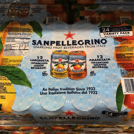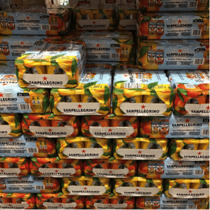 Signe de l’engouement des américains pour les eaux aromatisées, la marque San Pellegrino est présente en palette au sol avec un pack filmé de 24 références panachant 12 boîtes de citron et 12 boîtes d’orange.