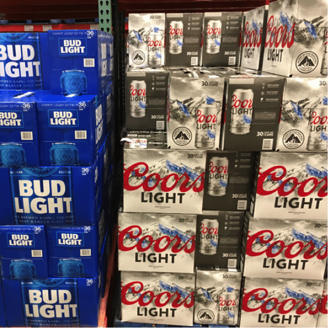 Au rayon des bières, la « grosse cavalerie » a pignon sur rue avec des marques comme Budweiser, Bud Light, Coors et consorts commercialisées en caisses carton de 30 à 36 boîtes selon les références.