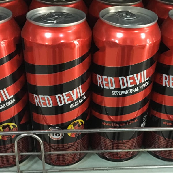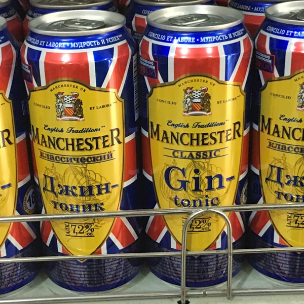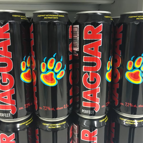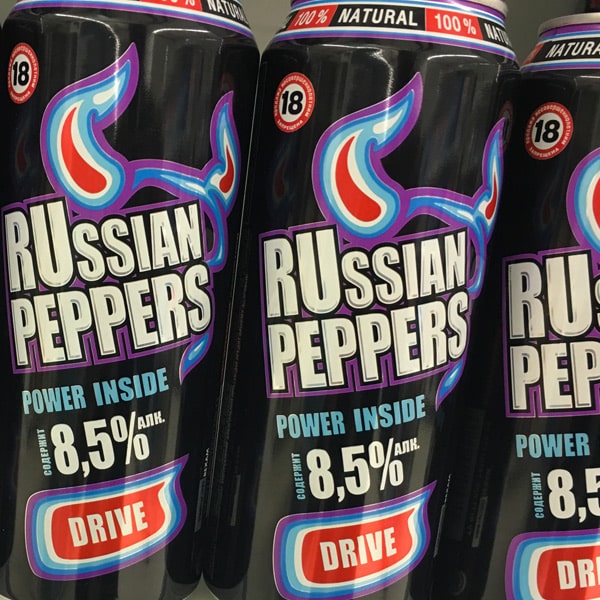 Parallèlement aux bières, deux autres types de boissons alcoolisées sont également disponibles en canettes. D’une part, des premix comme ce gin tonic facilement reconnaissable à son packaging frappé du drapeau anglais. D’autre part, des sortes d’energy-drinks alcoolisés. Ces boissons reprennent les codes graphiques de leurs pendants sans alcool, mais également l’usage du terme « power ». Des produits titrant 7,2°, voire 8,5° comme ce Russian Pepper. A noter la présence sur quelques boîtes d’un message sanitaire limitant la consommation aux plus de 18 ans.