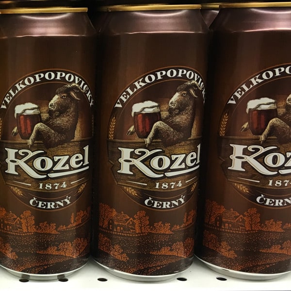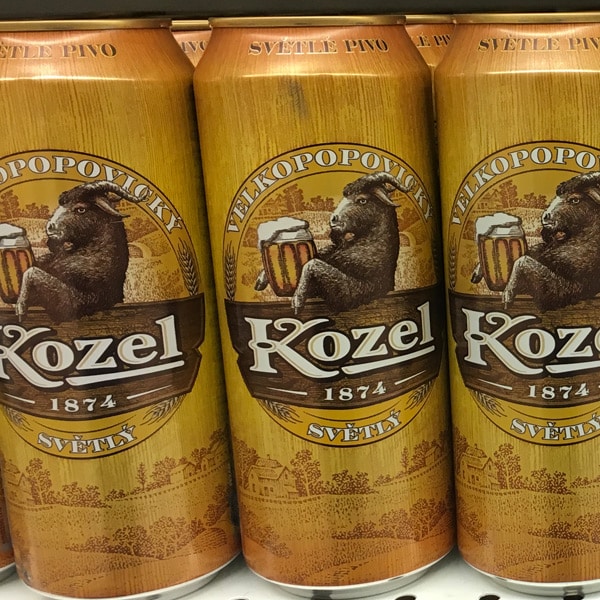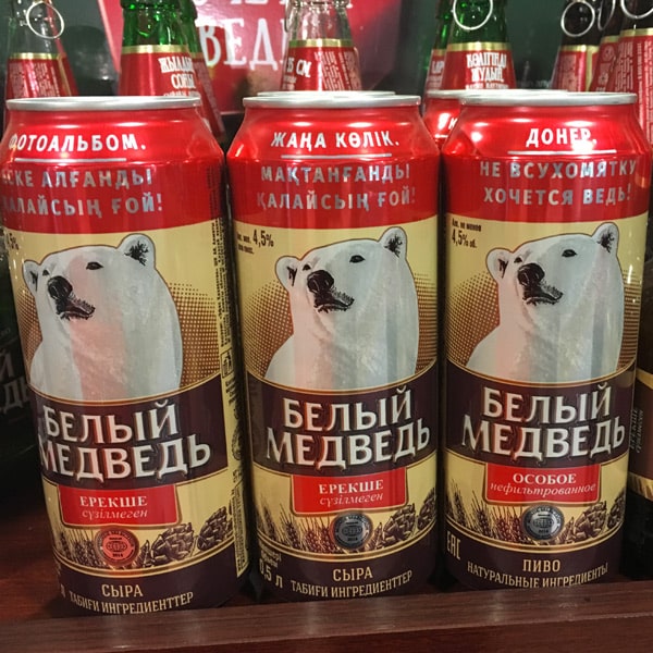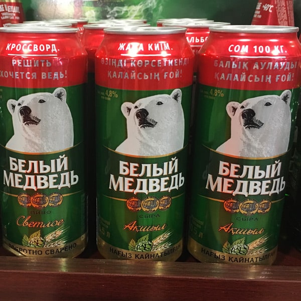 Deux constats majeurs : les grands formats type 50 cl sont très répandus et les boîtes sont très russophonesAu rayon bières, deux marques ont retenu notre attention. L’une ornée de la tête d’un ours blanc, l’autre, signée Kozel, d’origine tchèque, dont l’emblème est un bélier. A noter pour cette dernière la finesse du design déjà évoqué ici.